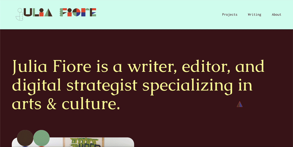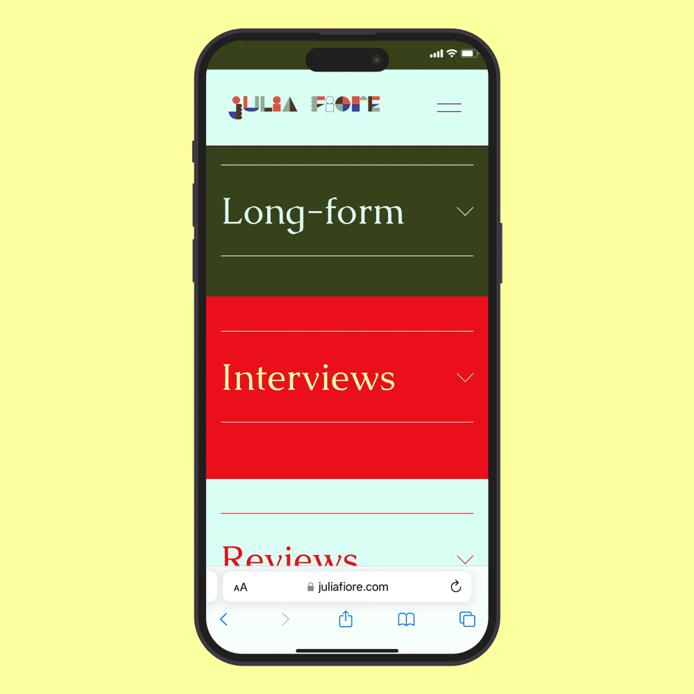 Julia Fiore, a digital strategist and writer working in arts and culture, tapped EC Studio to create a website and brand that would showcase her years of experience and help to attract new clients. A strategic plan was developed to bring together her core offerings—projects with art institutions and her extensive body of critical writing—into an engaging website and a playful yet professional brand. The website features a portfolio of recent projects as well as an archive of her writing. It also includes supporting pages for her services, client list, biography, and contact information designed to encourage inquiries from prospective collaborators. The high-saturation visual identity unifies the website and animation brings personality to every page.